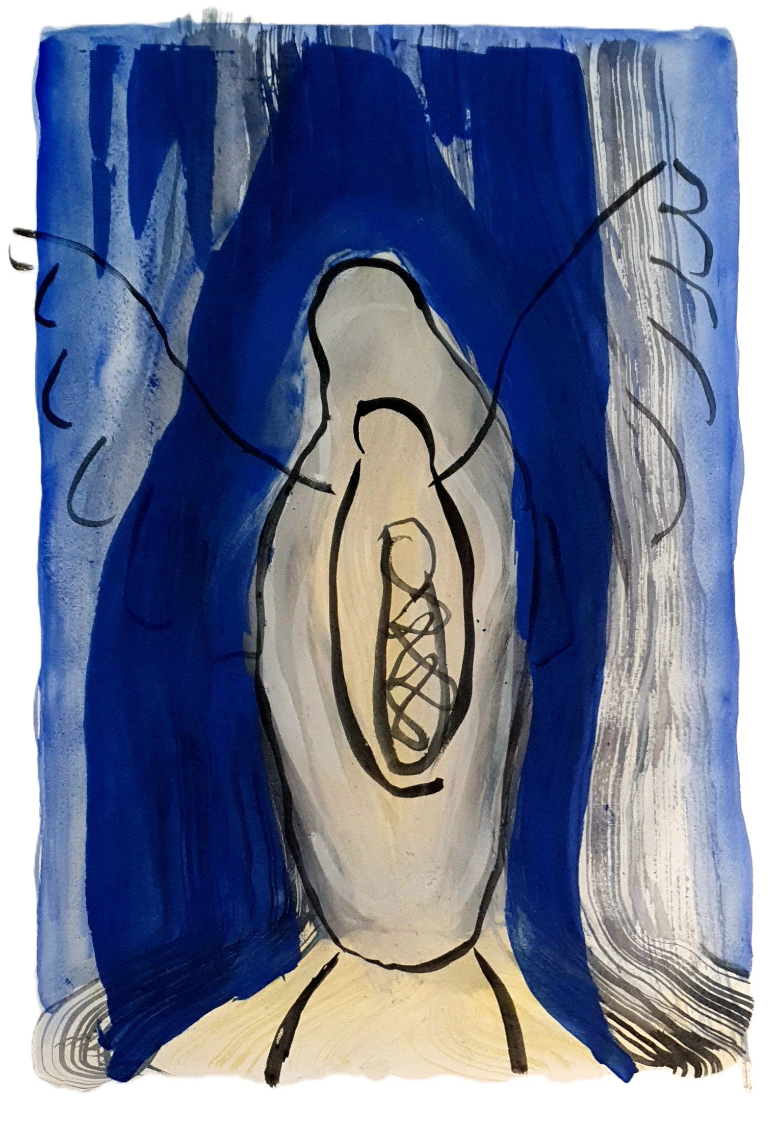 Under the title Becoming I express motifs that revolve around the relationship between the impermanent and the eternal; between loss and becoming; growth and weathering. They are symbolic and mental images - often in recognizable contours of landscape - mountains and water - mixed with abstract elements that lead the subject into a psychological existential framework of understanding. Pervasive is also the almost iconographic use of the ambiguous figure symbolizing a transitional state, which draws a wide range of associations with it. From the splitting of the chrysalis, a vessel for the soul, the Egyptian mummification of the dead, the story of Lazarus to the swaddled child. Instead of turning into a butterfly, these figures often develop more angelically.